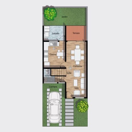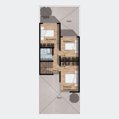 El diseño de esta casa es ideal para cualquier familia, cuenta con una correcta distribución, y es muy funcional. La planta baja tiene una gran estancia para la sala y el comedor; puede tener una cocina independiente o integrada al comedor; también en planta baja tenemos jardín y en un lateral contamos con patio de servicios. La planta alta cuenta con tres recámaras amplias con closet, que comparten un baño completo.