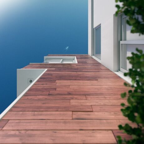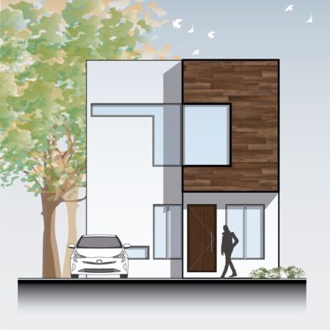 En la fachada se sugiere un acabado cerámico tipo madera para el volumen superior, este acabado puede ser cambiado a petición del cliente.