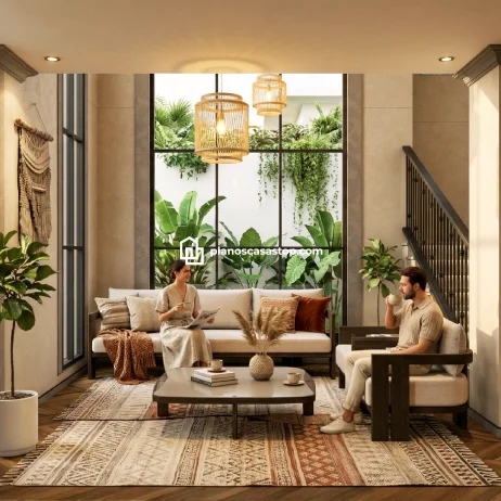 Al adquirir los planos de casa colonial Jazmín, descubrirás una planta baja diseñada para la convivencia. El acceso principal nos recibe con una estancia a doble altura que magnifica la sensación de espacio. Además, la zona social integra de manera fluida el salón principal con el comedor, ambos enmarcados por vistas hacia el jardín posterior.