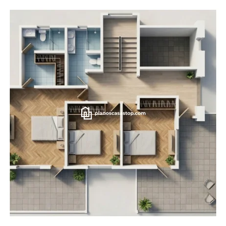 La zona privada de los planos de casa colonial Jazmín se encuentra en el segundo nivel. Aquí se distribuyen 3 dormitorios amplios, diseñados para garantizar el descanso absoluto. La suite principal destaca por su generoso vestidor y un baño privado de lujo. En consecuencia, los habitantes de esta habitación disfrutan de un refugio personal inigualable.