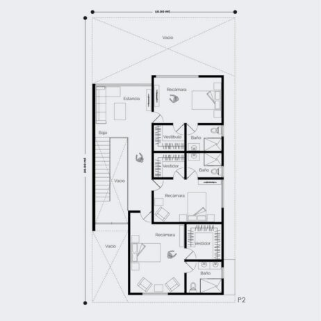 Planos de casa mexicana 10×20 de 2 pisos y 3 dormitorios mod. Sauce