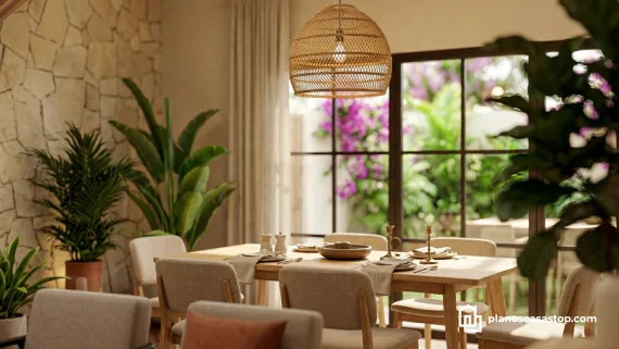 El diseño exterior de la casa no se queda atrás. La fachada, con sus líneas limpias y la combinación de tonos claros y el elegante acabado de piedra, presenta una estética moderna y atractiva. La cochera techada no solo protege los vehículos, sino que también añade una capa de sofisticación al diseño. El jardín posterior es un espacio ideal para el esparcimiento al aire libre, perfecto para una parrilla o un área de descanso. Por lo tanto, estos planos de casa colonial Sauce te ofrecen no solo una estructura, sino un estilo de vida completo.