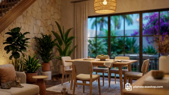 El diseño también incorpora una lavandería y un baño completo en la planta baja, garantizando la comodidad de todos los habitantes y visitantes. Por si fuera poco, los planos de casa colonial Sauce cuentan con una cochera con capacidad para dos autos, lo que resuelve un problema común en muchos diseños urbanos.