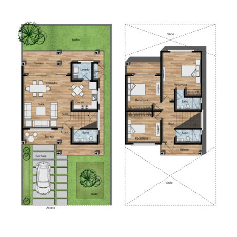 Planos de casa moderna 10×20 de 2 pisos con 3 dormitorios mod. Caoba