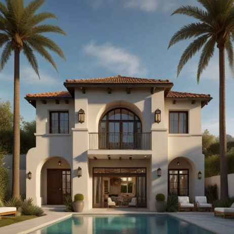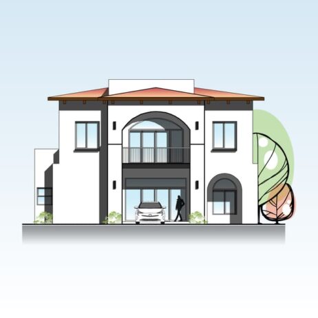 Planos de casa de estilo mediterráneo que destaca por su elegancia clásica y diseño atemporal. La fachada, en tonos blancos, incluye un techo de tejas rojas que resalta el estilo tradicional. El diseño de dos plantas cuenta con un arco central que enmarca un balcón, aportando simetría y sofisticación. Grandes ventanas y una entrada principal de cristal permiten una abundante iluminación natural en los espacios interiores. El camino de acceso, flanqueado por un cuidado jardín y altas palmeras, refuerza la sensación de amplitud y lujo.