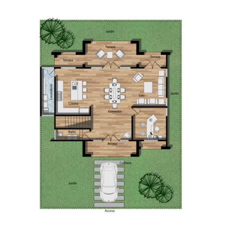 Este diseño de casa incluye 3 recámaras, 3 baños, sala, cocina comedor, estudio, sala de tv y terrazas. Este diseño de planos de casa es ideal para quienes buscan un hogar que combine detalles arquitectónicos tradicionales con comodidades modernas.