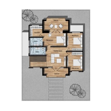 Planos de casa moderna 12×12 de 2 pisos con 2 dormitorios mod. Tikal