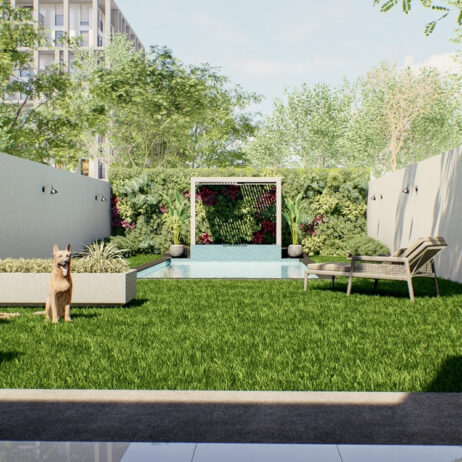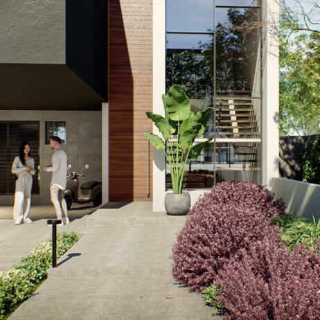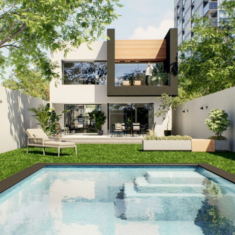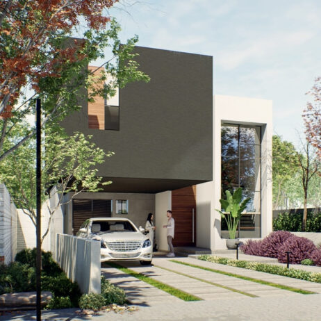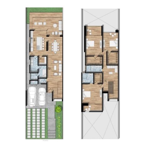 Los planos de esta casa de dos niveles revelan un diseño moderno que integra tres recámaras completas, cada una con su propio baño y vestidor privados. En la planta baja, una espaciosa cocina de concepto abierto fluye naturalmente hacia el comedor y la sala de estar, creando un ambiente perfecto para la vida familiar y las reuniones sociales. Grandes puertas corredizas conectan esta área con una terraza exquisita que ofrece vistas a la alberca, ideal para relajarse o entretenerse al aire libre.
