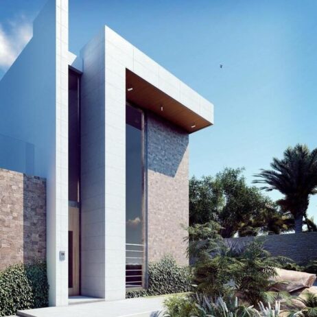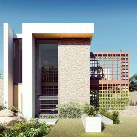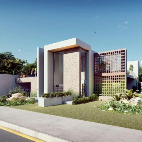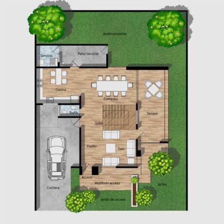 Los planos de la casa Tikal se distribuyen en dos niveles que albergan 2 recámaras completas y 3.5 baños. La planta baja es un espacio abierto en el que se comunican la sala, el comedor, la escalera, la cocina y el jardín evitando los muros divisorios. Al contar con un solo espacio libre, la casa se siente mucho más grande, se ventila e ilumina fácilmente y es mucho más cómoda. Las terrazas le proveen de luz natural a los interiores, además de que son áreas que se prestan para la convivencia familiar y el descanso. El acceso interior se eleva en una doble altura que produce una fachada interior llena de luz. La fachada se delimita por un muro frontal que se encuentra recubierto con acabado pétreo en tonos color tierra. La casa Tikal es un hermoso diseño de casa para cualquier familia.