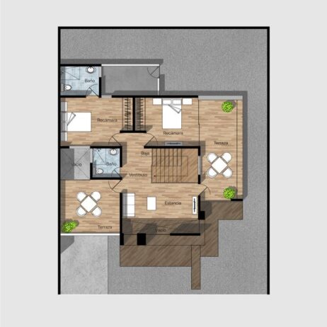 Planos de casa moderna 12×12 de 2 pisos con 2 dormitorios mod. Tikal