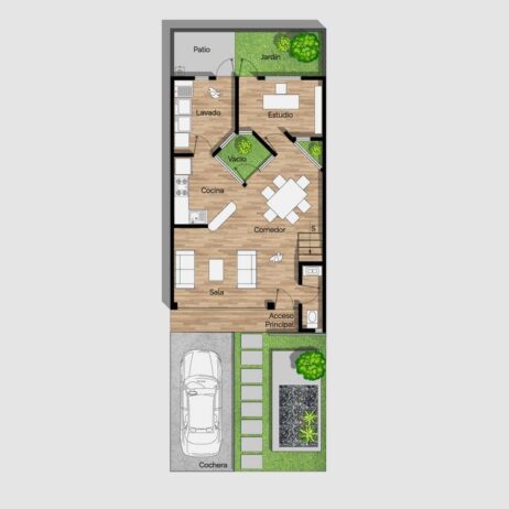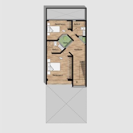 Planos de casa moderna 7×15 de 2 pisos con 2 dormitorios grandes mod. Cubos