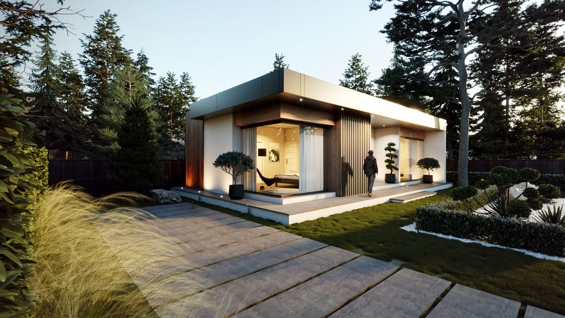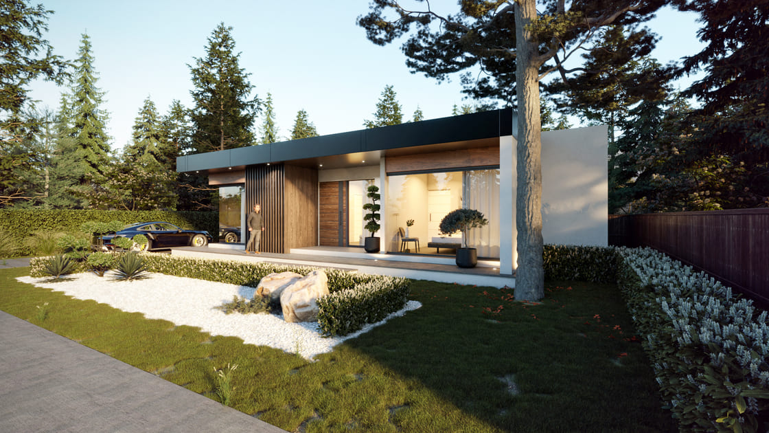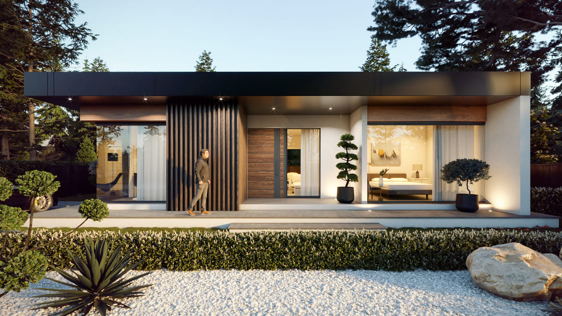 Descubre los planos de casa Parras, una propuesta arquitectónica moderna, funcional y elegante, ideal para terrenos de 15 metros de frente por 20 de fondo. Este diseño de un piso se adapta perfectamente a las necesidades de familias que buscan comodidad, estilo contemporáneo y una excelente distribución del espacio. Con un enfoque minimalista, la casa Parras destaca por sus muros en tonos negros y acabados en madera natural, que crean una estética sofisticada y acogedora al mismo tiempo. Su fachada moderna se complementa con amplios ventanales que permiten la entrada de luz natural y ofrecen vistas directas al jardín frontal y lateral.
