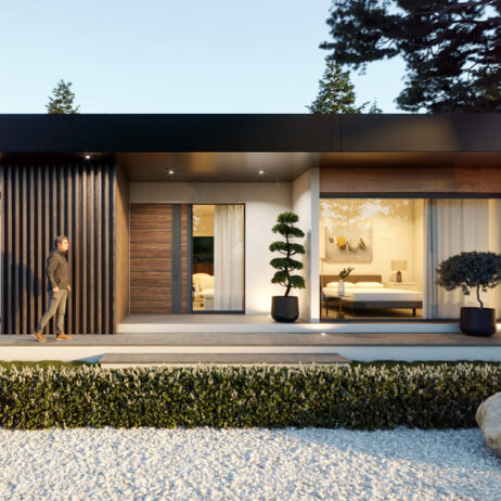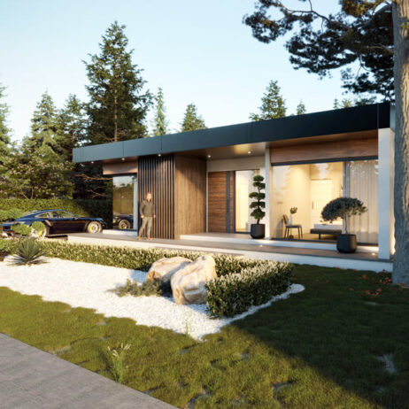 Descubre los planos de casa Parras, una propuesta arquitectónica moderna, funcional y elegante, ideal para terrenos de 15 metros de frente por 20 de fondo. Este diseño de un piso se adapta perfectamente a las necesidades de familias que buscan comodidad, estilo contemporáneo y una excelente distribución del espacio. Con un enfoque minimalista, la casa Parras destaca por sus muros en tonos negros y acabados en madera natural, que crean una estética sofisticada y acogedora al mismo tiempo. Su fachada moderna se complementa con amplios ventanales que permiten la entrada de luz natural y ofrecen vistas directas al jardín frontal y lateral.