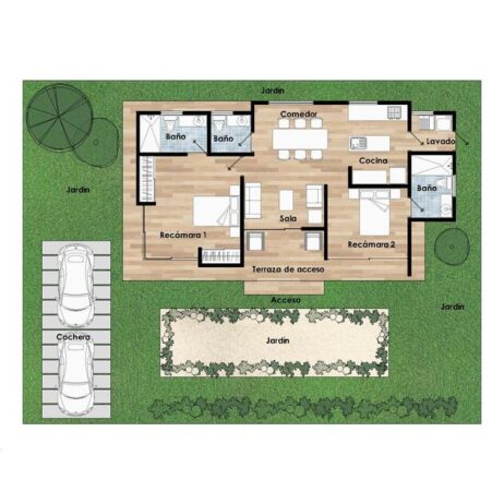 El diseño interior cuenta con: recámaras confortables, baños completos, Sala y comedor integrados en un espacio abierto, Cocina funcional con área de lavado, Terraza de acceso techada, Cochera doble lateral. Este plano aprovecha al máximo el ancho del terreno, permitiendo una distribución horizontal que brinda amplitud y privacidad a cada área. Además, el diseño contempla áreas verdes al frente, laterales y en la parte posterior de la casa, lo que garantiza ventilación cruzada y un entorno natural en todo momento. Incluye: planos arquitectónicos a color, distribución detallada de espacios, medidas específicas y diseño de fachada renderizado en alta calidad. No solo adquieres un plano, inviertes en un estilo de vida. Los planos de casa Parras son la solución perfecta para construir tu hogar moderno en un solo nivel.