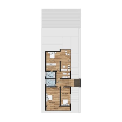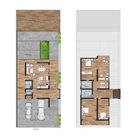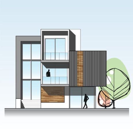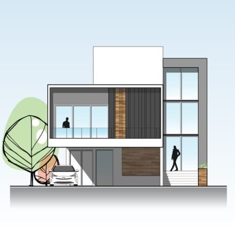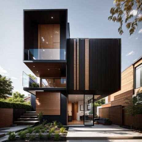 Esta casa moderna de dos pisos se caracteriza por un diseño geométrico único que combina elementos naturales y urbanos, utilizando madera clara y metal negro. Los amplios ventanales y los balcones con barandales de vidrio no solo aportan estética, sino que también permiten una mayor entrada de luz natural y vistas despejadas. La fachada de la casa está cuidadosamente diseñada para maximizar el espacio, mientras que el entorno ajardinado agrega un toque de serenidad. Estos planos de casa modernos son perfectos para quienes buscan un hogar contemporáneo, funcional y con detalles arquitectónicos que marcan tendencia.