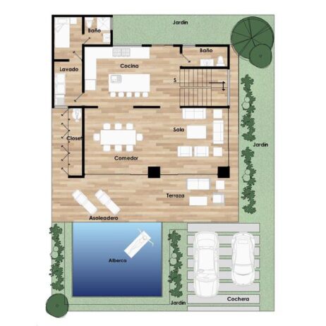 Descubre los innovadores Vallarta, una propuesta arquitectónica moderna ideal para terrenos de 15 metros de frente por 20 de fondo. Este diseño de un piso destaca por su elegancia contemporánea, combinando muros en tonos claros con acabados en madera natural y concreto aparente, lo cual crea una estética sobria y sofisticada, perfecta para climas cálidos o zonas costeras. Con una distribución eficiente y armónica, esta casa incluye: Amplias áreas sociales: sala, comedor y cocina integradas con acceso directo a la terraza y jardín. Un espectacular asoleadero junto a la alberca que invita al descanso.Tres recámaras en planta alta, cada una con baño propio y vestidor, brindando privacidad y confort.Family room ideal para momentos en familia, Cochera para dos autos y medio baño de visitas en la planta baja. El diseño aprovecha al máximo la iluminación natural gracias a sus grandes ventanales y una terraza frontal que conecta la vida interior con el exterior. Este proyecto es perfecto para quienes buscan funcionalidad, estilo moderno y conexión con el entorno natural. Adquiere los planos de casa Vallarta y empieza hoy mismo a construir la casa de tus sueños.