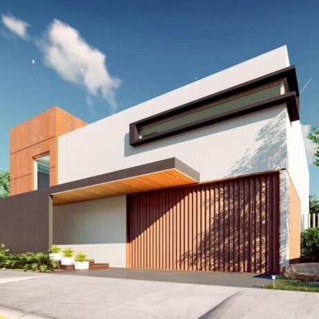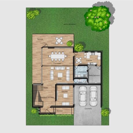 Planos de casa moderna y familiar. La entrega incluye tres planos y tres perspectivas renders exteriores. Estos planos describen el diseño de 350 m² de construcción para un terreno de 17 mt. de largo por 19 mt. de fondo. Los planos de la casa Rio incluyen un atractivo diseño moderno y funcional. Los espacios que integran este diseño se distribuyen cómodamente en dos niveles que se comunican por una escalera lateral que se ilumina desde el jardín. La planta baja es un amplio espacio que incluye la sala y el comedor con una hermosa vista hacia la terraza y jardín. La cocina cuenta con desayunador interior y se comunica fácilmente hacia las áreas de servicio.