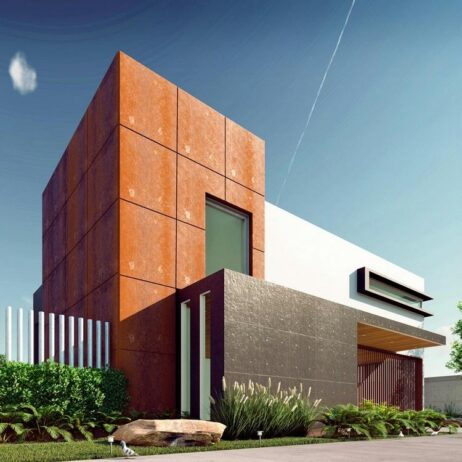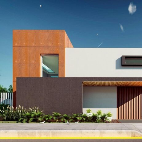 Las recámaras en la planta alta cuentan con baño y vestidor privados y se iluminan y ventilan naturalmente desde el jardín perimetral. El diseño de fachada considera un gran muro en planta baja con acabado en concreto aparente, que enmarca el vestíbulo de acceso a la casa. El módulo lateral de escalera se propone con recubrimiento a base de acero corten para resaltarlo del resto de la fachada. El bloque derecho resalta el largo ventanal de la recámara principal. Los espacios que integran la casa Rio son: cochera para dos autos, sala, comedor, cocina con desayunador, patio de servicio, lavandería, 3 recámaras, 3.5 baños, sala de televisión, estudio, terraza y jardín.