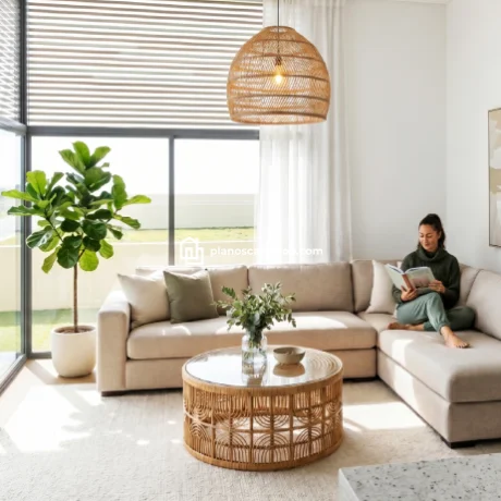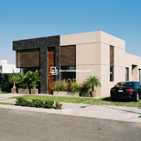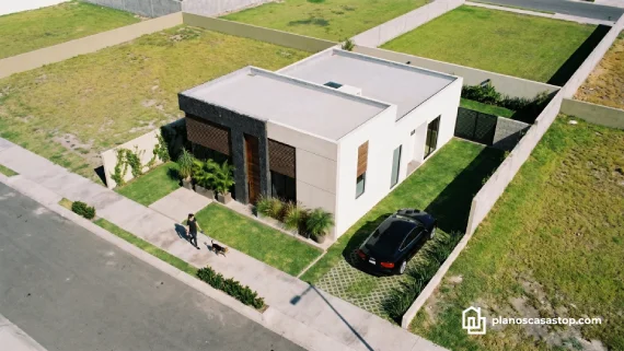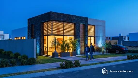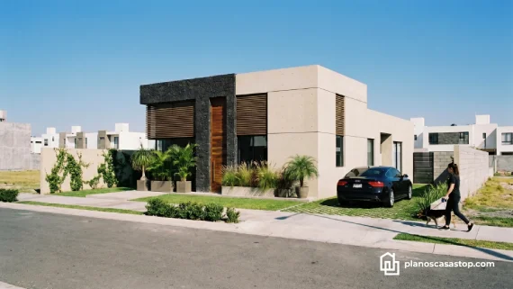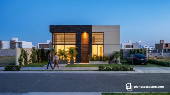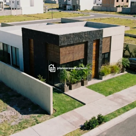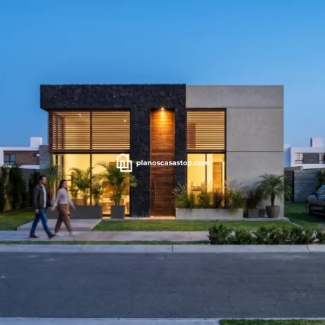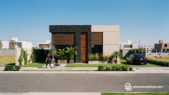 En cuanto al exterior, los planos de casa pequeña de 1 piso M destacan por un juego de texturas que incluye piedra volcánica oscura, concreto aparente y detalles en madera cálida. Esta combinación no solo aporta un aire de modernidad sofisticada, sino que también garantiza una durabilidad excepcional frente a los elementos climáticos.