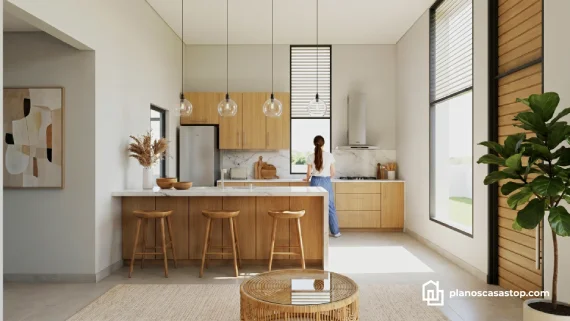 En estos planos de casa pequeña 1 piso M, el área social ha sido concebida bajo el concepto de planta abierta. La cocina, equipada con una elegante isla y gabinetes en tonos madera natural, se comunica de forma fluida con el comedor y la sala de estar. En consecuencia, se genera una sensación de amplitud que desafía los límites físicos de la estructura.