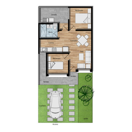 La distribución incluye dos cómodas recámaras, una sala-comedor de concepto abierto, cocina, baño completo, área de lavado y una hermosa terraza que conecta con el jardín. Gracias a su diseño versátil, estos planos de casa son perfectos para construir en diferentes tipos de terrenos, ya sea en entornos urbanos o rurales. Adquiere los planos de casa Aurora y materializa tu sueño de un hogar funcional con un estilo encantador y tradicional.