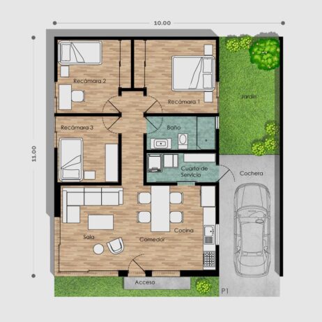 El interior de la casa ha sido meticulosamente planeado. La distribución abierta integra la sala, el comedor y la cocina, permitiendo una fluidez perfecta para la vida diaria y el entretenimiento. La cocina, con su isla central, se convierte en el corazón del hogar, ofreciendo funcionalidad y un estilo inigualable. Los [Planos de Casa pequeña Mía] incluyen tres recámaras bien distribuidas: la principal, que es un santuario privado, y dos recámaras secundarias, perfectas para la familia o como un espacio de trabajo flexible. Además, cuenta con un baño completo y un práctico cuarto de servicio. Un detalle clave es la cochera integrada para un vehículo.