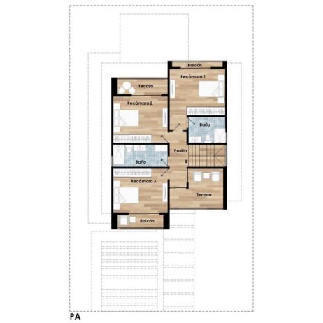 En la planta alta, encontrarás tres amplias recámaras, cada una con acceso a terrazas o balcones privados. La recámara principal dispone de baño propio, mientras que las secundarias comparten un baño completo. Este diseño ofrece el equilibrio perfecto entre funcionalidad y diseño moderno.