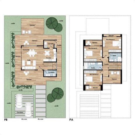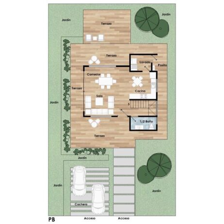 En la planta baja, la distribución abierta conecta sala, comedor y cocina, maximizando la iluminación natural y el confort. Además, cuenta con medio baño, área de lavado y terrazas exteriores que rodean el hogar, invitando al descanso y la convivencia.